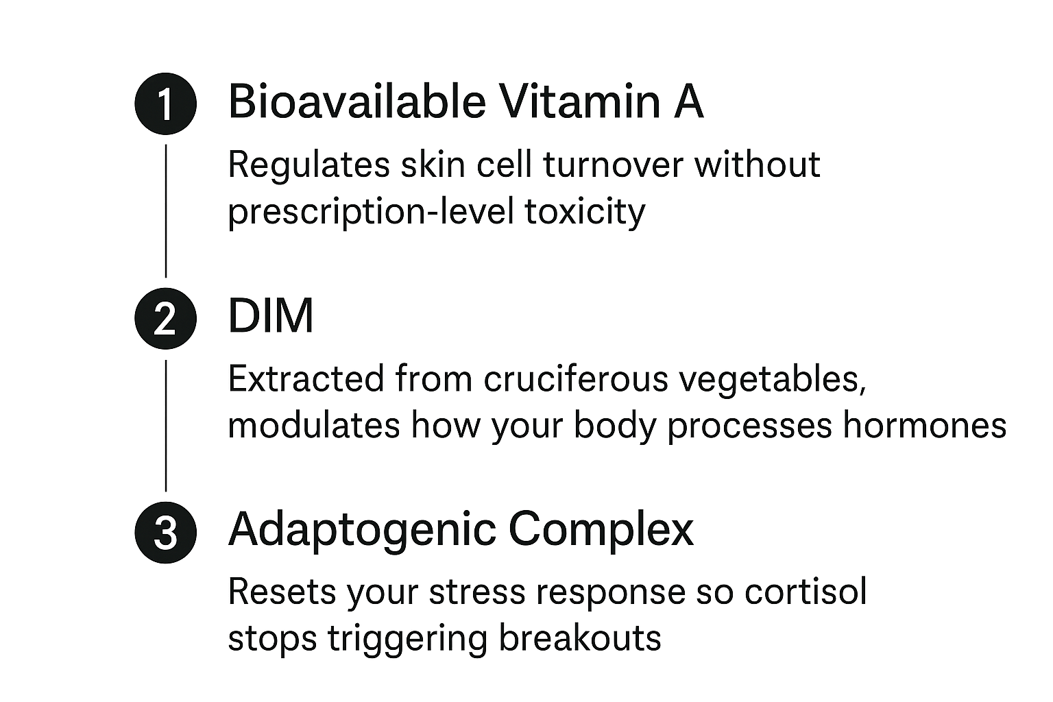 Key ingredients include DIM (blocks excess androgens like Spironolactone, naturally), bioavailable Vitamin A (regulates sebum production without Accutane's severe side effects), Glutathione and Turmeric (neutralize inflammatory pathways), Vitamin B5 (repairs skin barrier and accelerates healing), and adaptogenic compounds (lower cortisol to stop stress-triggered breakouts).